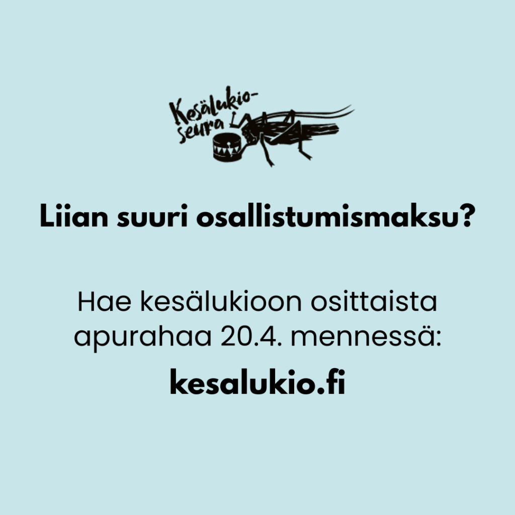 Huomaathan, että osallistuessasi kesälukioon, sinun on mahdollista anoa Kesälukioseuralta apurahaa kesälukion osallistumismaksuun taloudellisin ja sosiaalisin perustein! Apurahahakemukset tulee lähettää viimeistään 20.4. nettilomakkeella täällä: https://kesalukio.fi/apuraha-anomus